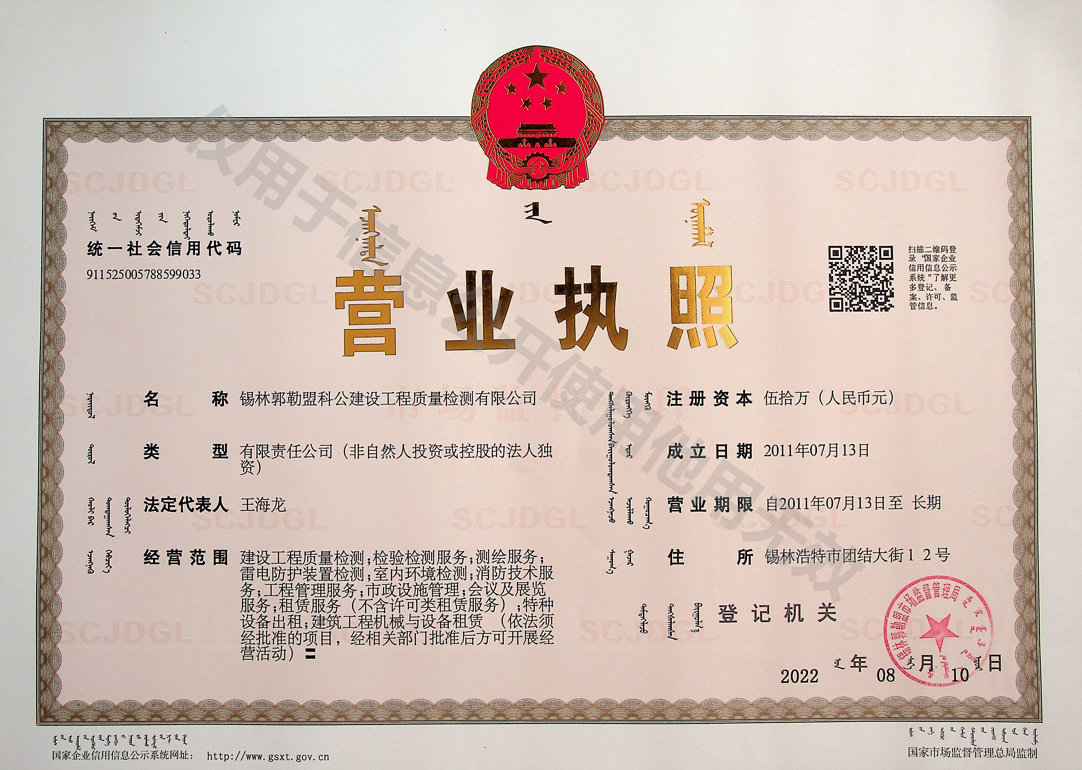 錫林郭勒盟科公建設(shè)工程質(zhì)量檢測有限公司其前身為錫林郭勒盟科公建設(shè)工程質(zhì)量檢測中心,于1986年經(jīng)錫林郭勒盟行政公署批準(zhǔn)成立,隸屬于原錫林郭勒盟住建局質(zhì)量安全監(jiān)督站。承擔(dān)錫盟地區(qū)建設(shè)工程實體、市政、建材產(chǎn)品及有關(guān)建筑工程材料的質(zhì)量檢測工作,是專業(yè)從事工程質(zhì)量檢測鑒定的權(quán)威建設(shè)工程質(zhì)量檢測機(jī)構(gòu)。于2021年6月并入錫盟城投集團(tuán),成為全資子公司。是錫林浩特市唯一一家國有性質(zhì)的建設(shè)工程質(zhì)量檢驗檢測機(jī)構(gòu)。